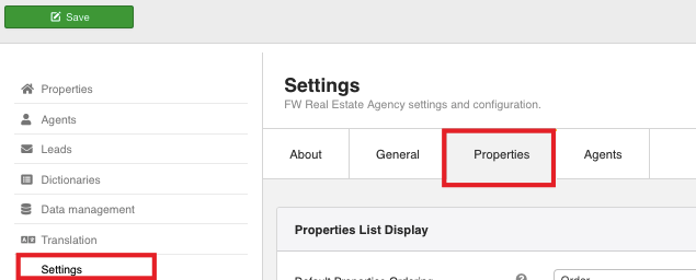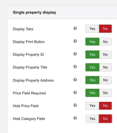 Locate Display Tabs field and set it as No. Thus, all property details will be displayed under the single property image as sections one below the other, not as tabs.