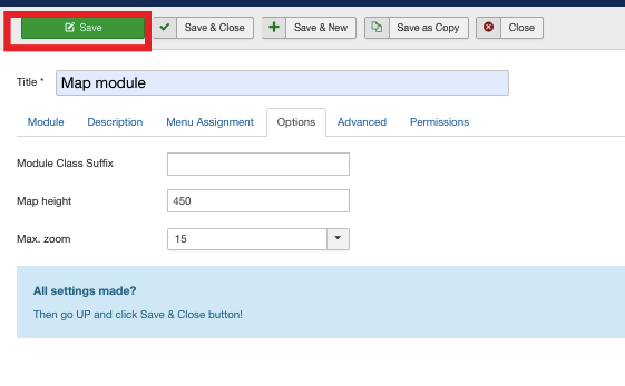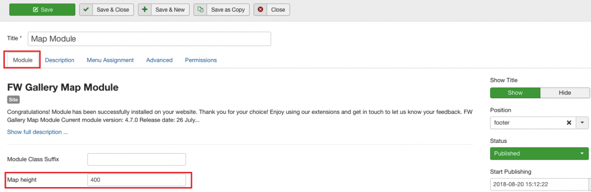 Locate Module tab and configure it. Assign position to the module and give it a title. Use the sample parameters listed in the FW Real Estate Map module configuration and settings section of this tutorial. Your screen should look similar to the screenshot below.