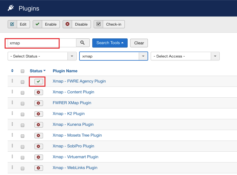 - Enable Xmap - FWRE Agency plugin. To learn how to enable the plugin, review steps 1-7 of How to configure FW content search plugin. Use the search bar to find a plugin. Your screen should look similar to the screenshot below.