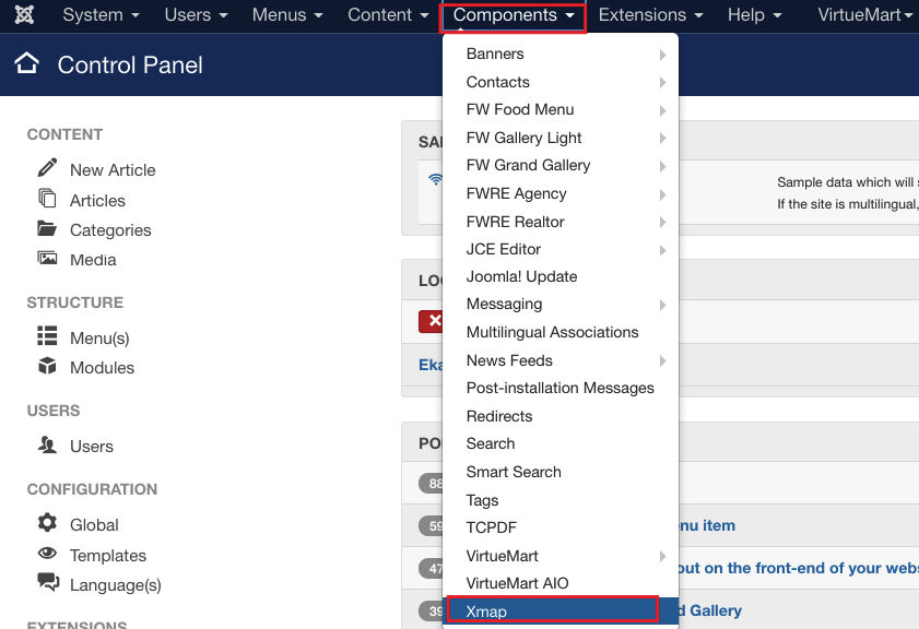 Locate Components dropdown in the top menu of your Joomla control panel and click on it.