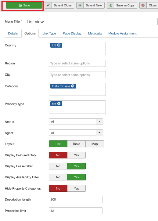 Locate Country dropdown and choose USA from the list. Thus, you indicate that only US property will be displayed for List View menu item.