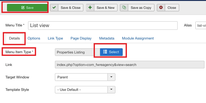 To display a menu item, you need to create a menu item and assign Properties listing layout to it. To learn how to create a menu item, follow the steps below: