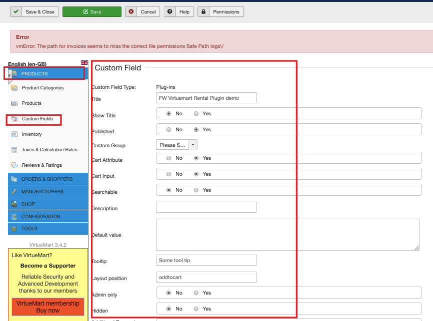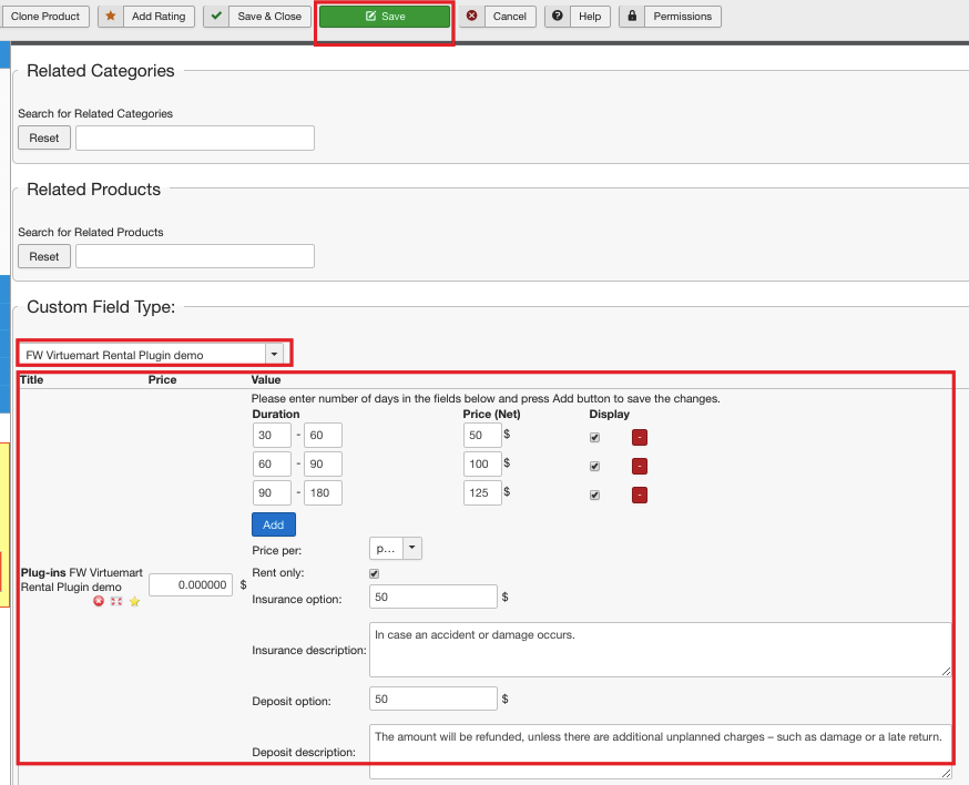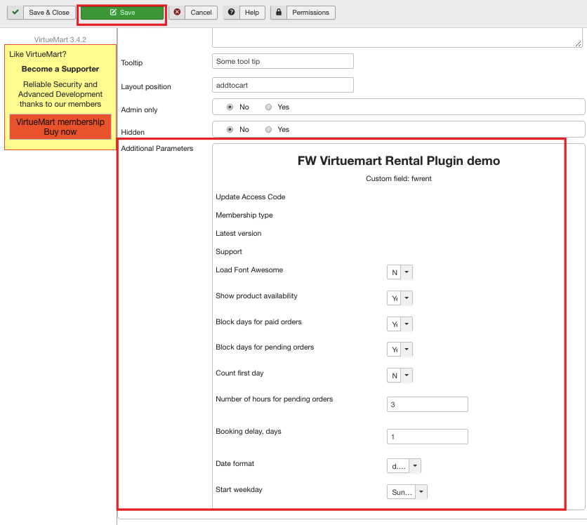Go to the additional parameters dropdown and choose FW VM Rental from the list. As a result, a part of the plugin parameters will be displayed. So set the plugin parameters on the custom field level as is shown on the screenshot below. Don’t forget to save your configuration.