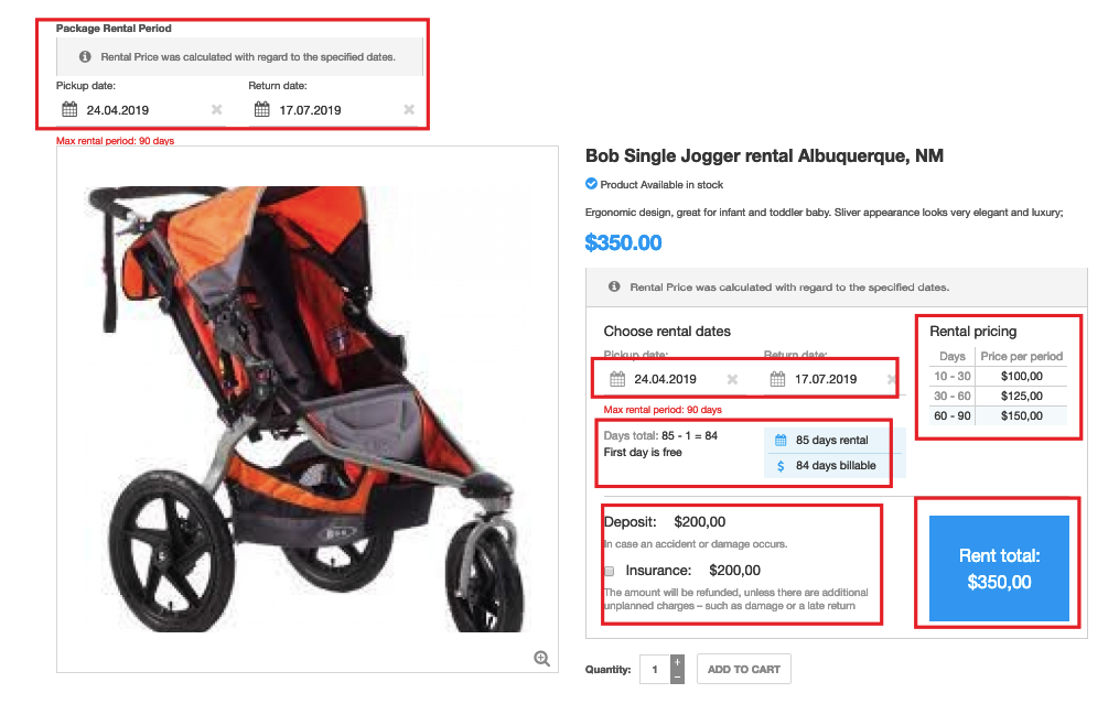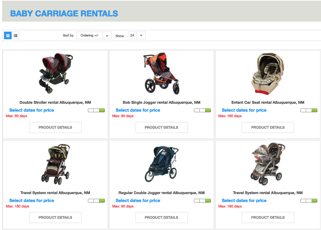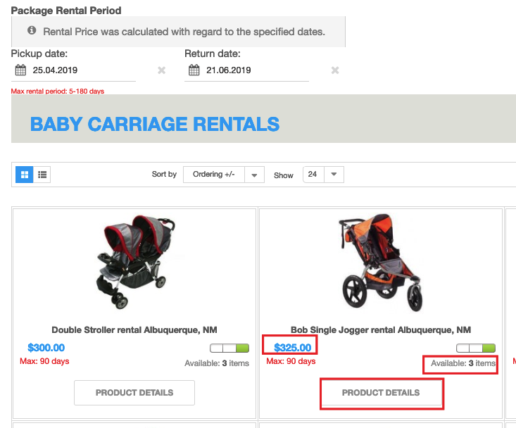 - Configure and display Rental Dates Module. As a result, all baby carriages available for the dates specified within the module will be displayed on the category page. Along with that, the calculated total rental price and stock number will be displayed for each particular product. See the screenshot below: