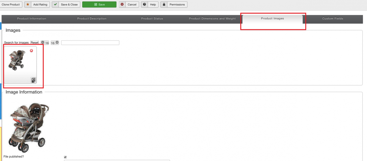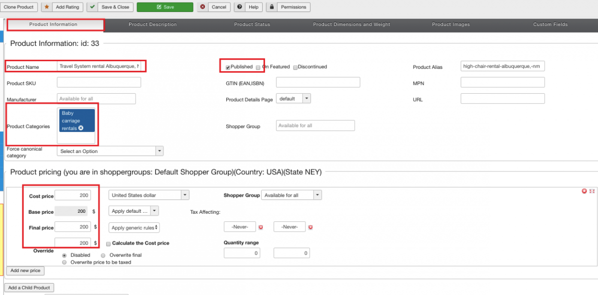 - Add products to the category. Configure product settings as is shown on the screenshots below. Add product title, check it as “published”, assign “Baby Carriage Rentals” category to the product, set a price, etc.