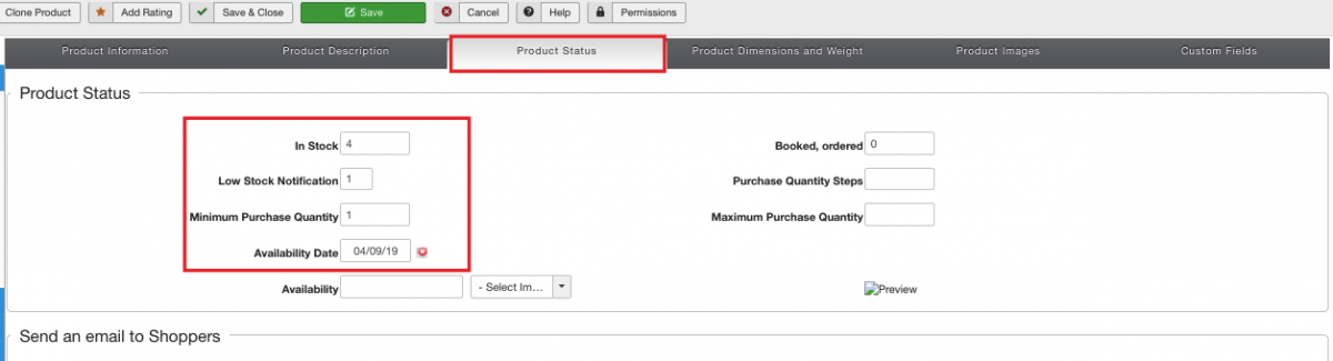 Set product status parameters as is shown on the screenshot below. Once set, you will be able to receive low stock notifications, display stock control indicator, and stock quantity for a product being added.